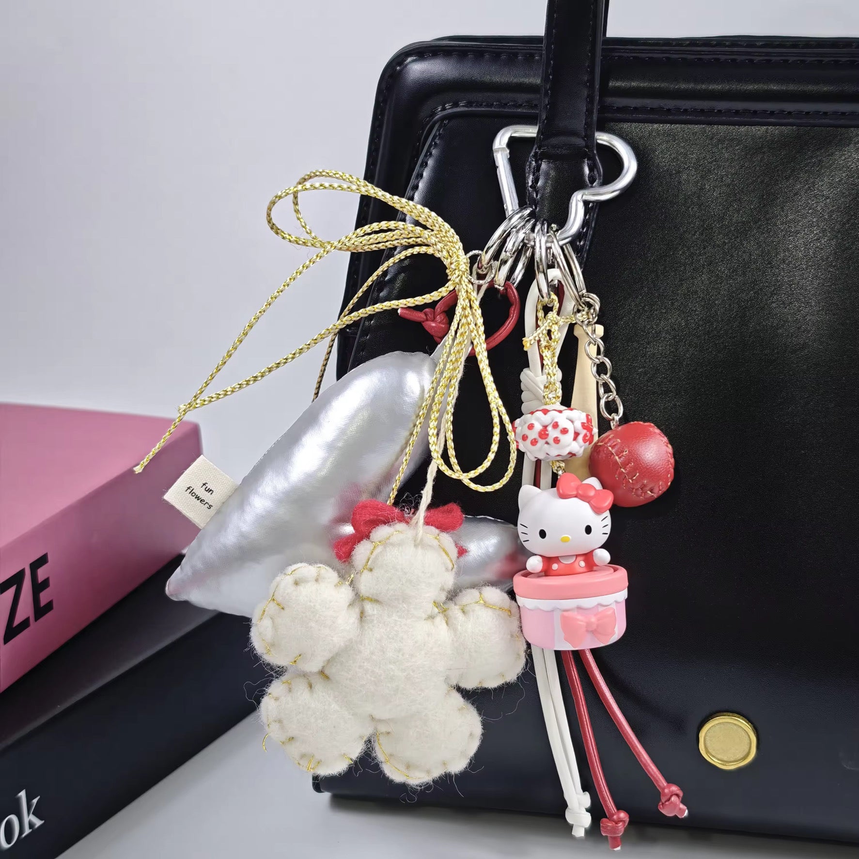 Infuse your handbag with a splash of cuteness with this adorable Hello Kitty bag charm. Featuring Hello Kitty perched on a pink macaron, a plush white flower with a red bow, and a shiny silver heart pillow, this charm is perfect for adding a playful touch.