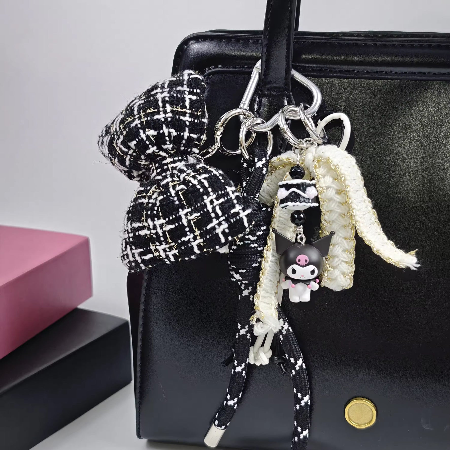 Enhance your handbag with this sophisticated black and white tweed bow bag charm. Featuring a stylish braided white and gold ribbon and an adorable Kuromi figurine adorned with a black hat and pink skull print, this charm adds a uniquely dark and trendy touch to any bag.